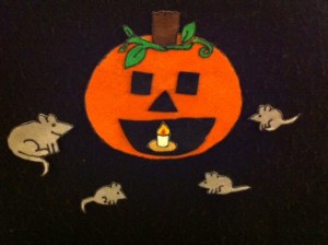 One day in the fall, a little gray mouse found a big orange house. She nibbled a hole in the middle, to make a door. And she nibbled two holes up near the top, to make two windows. And then she nibbled a wide hole near the bottom, so that all her children could run in and out. Then she put a candle inside to light up the darkness.