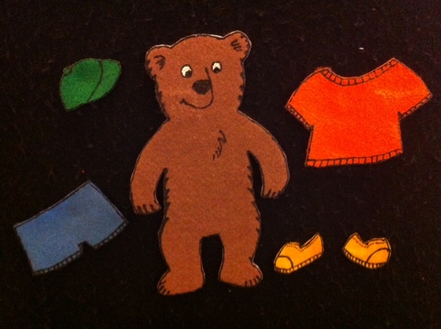 He puts on his shirt. (Place shirt flannelboard piece on bear’s legs.)