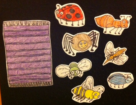 Place all the bugs on the board and name each one. Then put the rug up. Tell the kids that you are going to play a game and hide one of the bugs under the rug. They close their eyes, and you hide one bug. Tell them to open them, then say,