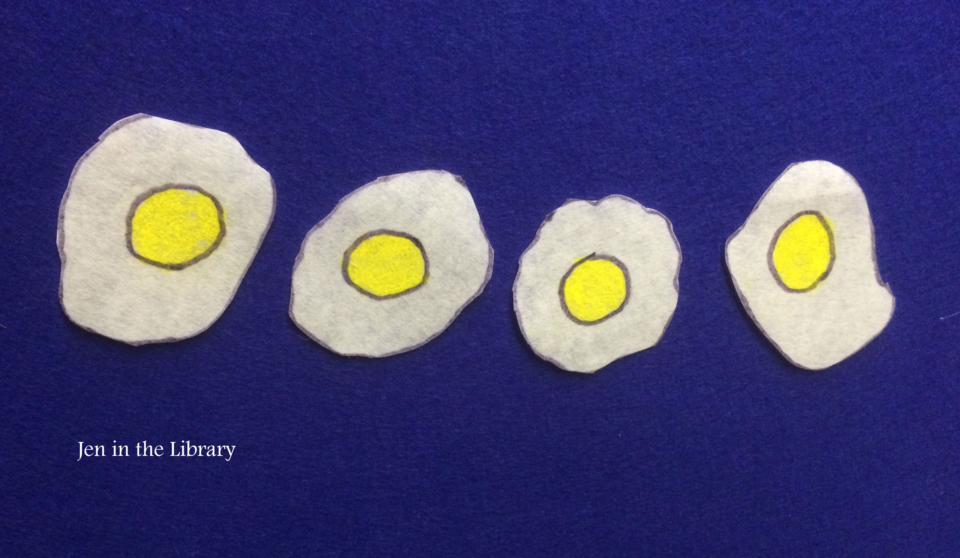 Four eggs frying on the griddle. (place egg on flannelboard)