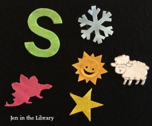 This is an element that I stole from my co-worker AnnMarie, as a way to address letter knowledge. To introduce the theme of my toddler storytime, I start by talking about what letter it starts with. I put the letter up, and then we say the name of the letter, draw it in the air with our finger, and then do the sound it makes. Then we talk about some items that start with that letter. For this storytime, I picked a snowflake, a sun, a smile (inside the sun), a stegosaurus, and a star. As my very last element I put up I use what our storytime will be about — this time, a sheep!